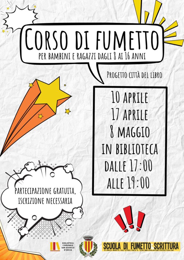 Per ragazzi dagli 8 ai 16 anni Nell’ambito del progetto “𝑆𝑎𝑛 𝑄𝑢𝑖𝑟𝑖𝑐𝑜 𝐶𝑖𝑡𝑡𝑎̀ 𝑑𝑒𝑙 𝑙𝑖𝑏𝑟𝑜” ad aprile 2025 arriva il corso di fumetto, realizzato dalla Scuola di Fumetto e Scrittura di Siena! I giorni 10 aprile, 17 aprile, 8 maggio, appuntamento in biblioteca dalle 17:00 alle 19:00 con il laboratorio di fumetto, dal titolo “Fumetti…