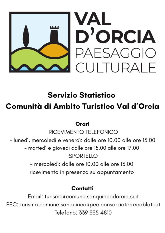 Orari RICEVIMENTO TELEFONICO – lunedì, mercoledì e venerdì: dalle ore 10.00 alle ore 13.00 – martedì e giovedì dalle ore 15.00 alle ore 17.00 SPORTELLO – mercoledì: dalle ore 10.00 alle ore 13.00 ricevimento in presenza su appuntamento Contatti Email: turismo@comune.sanquiricodorcia.si.it PEC: turismo.comune.sanquirico@pec.consorzioterrecablate.it Telefono: 339 335 4810 Il Comune di San Quirico d’Orcia, in conformità…