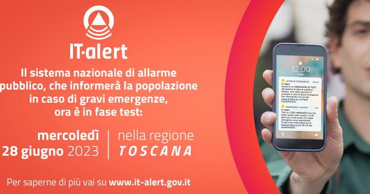 Nei prossimi giorni verrà avviata la sperimentazione a livello nazionale della piattaforma “IT-Alert”, il sistema di allarme pubblico sviluppato dal Sistema Nazionale della Protezione Civile, che ha lo scopo di inviare messaggi sui dispositivi delle persone presenti nell’area interessata da una grave emergenza o da un evento catastrofico imminente o in corso. La Regione Toscana sarà la prima regione d’Italia a testare il sistema attraverso il coinvolgendo di tutti i cittadini e il test avverrà il giorno 28 giugno, intorno alle ore 12.